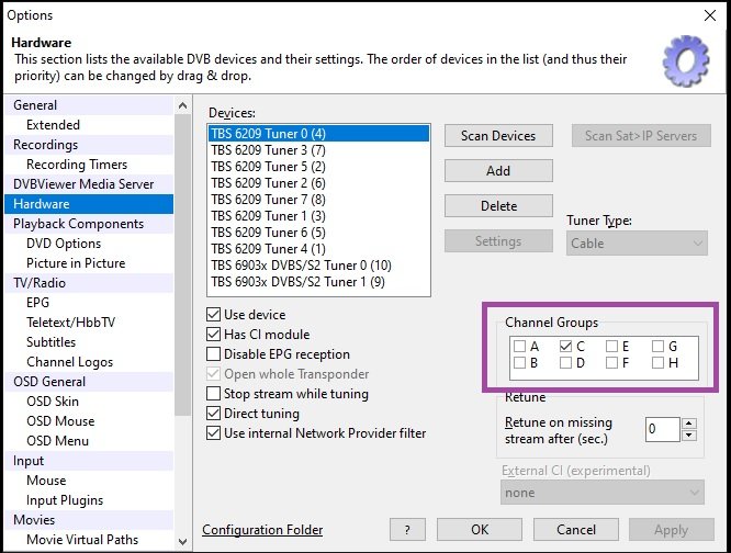 Griga Posted May 2, 2024 Posted May 2, 2024 vor einer Stunde schrieb ADELKOM: 8+2: 10 tuner Usually you don't need channel groups, even if you had 100 satellite and 100 cable tuners. Channel groups must only be used for very special cases. I don't see such a special case in your setup. Don't change the default channel group settings, if you don't understand the meaning of channel groups! Here is an example for a special case that needs channelgroup configuration: If you have 2 satellite tuners, one connected to a dish pointing to Hotbird 13.0° East, and the other one to another dish pointing to Astra 19.2° East, DVBViewer doesn't know which tuner can receive Hotbird channels and which tuner can receive Astra channels. So you have to configure manually by using channel groups which tuner can receive which channels. Quote