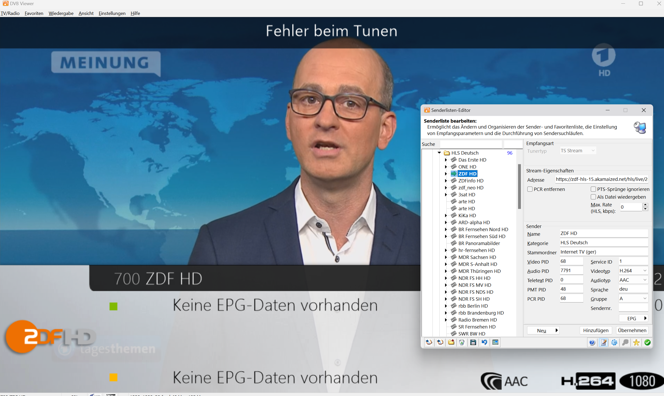 awehring Posted January 23 Author Posted January 23 Am 21.1.2025 um 20:46 schrieb Griga: Das Änderungsdatum der Datei müsste der 25.12.2024 7:56 sein. Gerade noch mal auf dem Laptop überprüft, auf dem ich den DVBViewer 7.3.1 Installer getestet und auch die Liste in den DVBViewer geladen habe. Dort funktionieren die Sender. Aktueller ham'wer nich... Danke fürs Feedback. Leider klappt es bei mir nicht. Ich habe in dem angegeben Ordner geprüft, die Datei "6500_Internet TV (ger).ini" ist vorhanden und hat auch genau diesen Zeitstempel. Ich habe jetzt im Senderlisten Editor die alten Sender gelöscht und dann die Datei mit Drag and Drop hineingezogen und sicherheitshalber nochmals auf "Übernehmen" geklickt. "Das Erste" und einige andere Sender kann ich wiedergeben, wenn ich auf "ZDF HD" doppelklicke kommt "Fehler beim Tunen": Quote