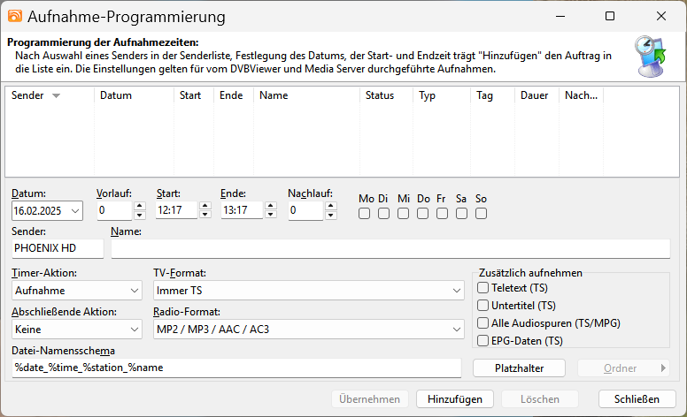 Griga Posted February 16 Posted February 16 vor 7 Minuten schrieb Mentor 54: Muss der Sender, für den man eine Aufnahme programmieren will, eigentlich auch aktuell wiedergegeben werden? Nein. vor 8 Minuten schrieb Mentor 54: In dem angehängten Beispiel konnte ich PHOENIX HD, das ich gerade geschaut habe, jedenfalls nicht einfach mit einem anderen Sendernamen überschreiben In das Feld kannst du nichts eingeben. Du musst den Sender in der in das Fenster integrierten Senderliste wählen, die du aber (wahrscheinlich versehentlich) ausgeblendet hast. Klicke rechts in das Listenfeld im oberen Bereich -> Senderliste anzeigen oder drücke einfach Strg + H. Quote