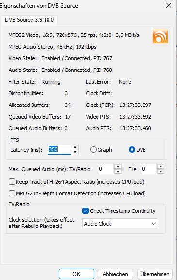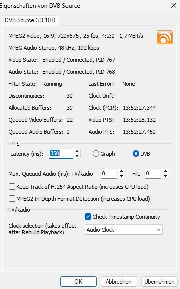 Griga Posted May 27 Posted May 27 13 hours ago, Uwe-HH said: Gibt es eigentlich die Option, alle veränderten Einstellungen auf Standartwerte zurückzusetzen? Du kannst den gesamten Inhalt des Konfigurationsordner löschen (siehe Hilfe-Menü im DVBViewer) oder besser woanders hin verschieben, falls du es später bereust. Dann meldet sich beim nächsten DVBViewer-Start der Setup-Wizard, und du fängst wieder bei 0 an. 13 hours ago, Uwe-HH said: Zudem ist am oberen Rand des Bildes eine Störung - es schaut so aus, als ob die Bildzeile verschwindet- und dann gleich wieder aufgebaut wird. Tritt das auch bei den öffentlich-rechtlichen HD-Sendern auf? Eventuell kannst du dem entgegenwirken, indem du das Bild mit den Zoom-Einstellungen minimal vergrößerst, so dass die Bildzeile herausfällt. Insgesamt würde ich sagen, mit deiner Grafikkarte läuft es nicht wirklich rund. Aus der Ferne lässt sich aber nur schlecht beurteilen, woran es liegt und was man da machen könnte. 13 hours ago, Uwe-HH said: Was mir auch aufgefallen ist (siehe Bild "Prozentanzeige") dass dort nur 58% angegeben werden, kann ich den Wert verbessern, ist das vielleicht auch relevant? Weder sowohl noch als auch Wenn du beim TV-Empfang die Eigenschaftsseite des DVBViewer Filters aufrufst (Einstellungen -> Filter -> DVB Source), zeigt sie dann eine steigende Anzahl Diskontinuitäten an, oder bleibt der Wert stabil bzw. auf 0? Quote