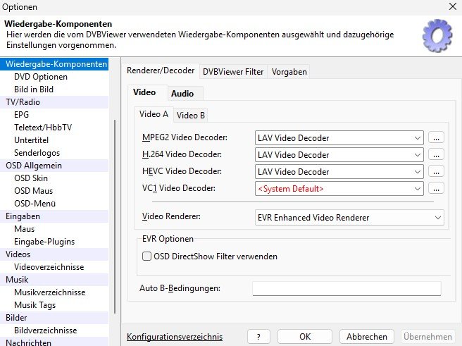 Griga Posted May 22 Posted May 22 Eine für die Videoausgabe relevante Einstellung im DVBViewer ist Optionen -> Wiedergabe-Komponenten -> Video -> Video Renderer. Dort würde ich zumindest mal probeweise vom EVR Custom auf EVR Enhanced umstellen. Wenn es damit nicht besser ist: Die anderen Optionen für den Video Renderer sind seit Windows Vista eigentlich nicht mehr angesagt, weil sie ein hardware-beschleunigtes Dekodieren von Video verhindern (außer man stellt auf der Eigenschaftsseite des LAV Video Decoders DXVA2 copy-back ein), aber eventuell auch einen Versuch wert. Mehr als explodieren kann dein PC dabei ja nicht. Eine andere Möglichkeit ist die Installation von Third Party Video Renderern (MadVR oder MPC VR). Mehr dazu bei Bedarf. Quote