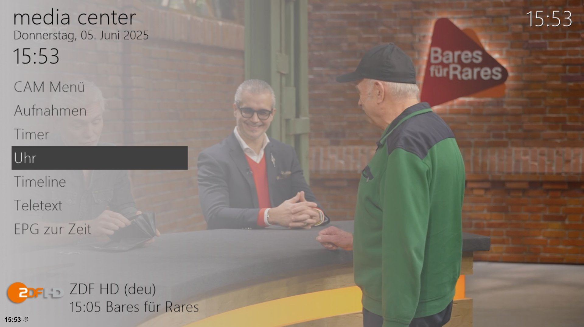 Griga Posted June 5 Posted June 5 2 hours ago, Frankobert said: Die Uhr im OSD-Modus ist mir aber immer noch zu groß. Es wird gegessen, was auf den Tisch kommt Oder du musst selbst kochen. Aussehen, Größe, Position, Zeitformat usw. der Uhr wird im jeweiligen OSD Skin durch die Datei myClock.xml definiert, d.h. im von dir verwendeten Default Skin durch C:\Program Files (x86)\DVBViewer\OSDSkins\Default\myClock.xml. Die Uhr sieht in jedem Skin anders aus, z.B. im von mir verwendeten Concinnity-Skin so: Wenn du in die XML reinschaust, siehst du, dass der Default Skin "TitleFont" verwendet. Die verwendbaren Fonts wiederum sind in der Datei font.xml definiert. TitleFont hat eine Höhe von 36. Tauscht du ihn in myClock.xml z.B. gegen font24 aus, ist die Schrift viel kleiner. Schaut man sich in anderen Skins um, z.B. in OldDefault, sieht man, dass die Uhr auch ein Hintergrundbild haben kann. Im Default Skin besteht sie nur aus einem Label. Wenn du einen der Skins modifizierst, die der DVBViewer standardmäßig mitbringt, werden deine Änderungen bei jedem DVBViewer-Update überschrieben. Deshalb solltest du in dem Fall einen eigenen Skin einrichten, z.B. in einem Ordner C:\Program Files (x86)\DVBViewer\OSDSkins\DefaultMod\. Dorthin kopierst du den gesamten Inhalt des Default-Ordners und nimmst dort die Änderungen vor. Den DefaultMod Skin wählst du dann unter Optionen -> OSD Skin aus. 5 hours ago, Griga said: Inwiefern ist die OSD-Uhr nicht ständig? Stimmt, sie ist nach einem DVBViewer-Neustart weg. Müsste man eigentlich ändern... Wenn man den DVBViewer mit dem Kommandoparameter -x2010 startet wird die OSD Uhr automatisch eingeblendet, habe ich gerade herausgefunden. Die zuständige Nummer 2010 steht in der actions.ini. Weitere Hinweise bei Bedarf. 2 Quote