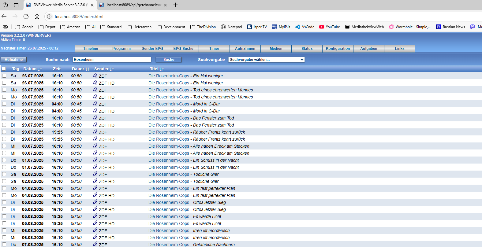 DetlefM Posted July 25 Posted July 25 I experienced strange behavior when trying to use the API. Background: I reactivated a Windows 10 PC that was in use as a media server until about a year ago to avoid damaging my active media server settings with my API attempts. This "old" PC has this version: <version iver="50463232" ires="0">DVBViewer Media Server 3.2.2.0 (WINSERVER)</version>. In any case, I downloaded the EPG data and channels via curl http://winserver:8089/api/epg.html?lvl=2 > epg.xml and curl http://winserver:8089/api/getchannelsxml.html > channels.xml And in doing so, I received EPG data whose channel ID had no equivalent in channels.xml. Even when searching in the search window (Web GUI), I couldn't find sample programs that were in the EPG (see screenshot). Where could this EPG data come from? I don't use any external service or import, I just use the MediaServer for this. The example data set is here: <programme start="20250726065500" stop="20250726074000" channel="563521184333847"><eventid>44683</eventid><content>21</content><charset>255</charset><titles><title>Die Rosenheim-Cops</title></titles><events><event>Konkurrenz erlegt das Geschäft</event></events><descriptions><description>15. Staffel, Folge 14: Wer hat die Dirndlschneiderin Babette Feichtner ermordet? Stadler und Hansen machen ein Motiv bei ihrer Schwester und ihrem Mann aus. Aber erst eine Überwachungskamera liefert die benötigten Beweise. D 2015. 44 Min. Von Jörg Schneider, mit Igor Jeftic, Dieter Fischer, Max Müller. [16:9] [5.1]</description></descriptions></programme> You will find the xml data here (too big for the forum) https://onedrive.live.com/?redeem=aHR0cHM6Ly8xZHJ2Lm1zL2YvYy9kZmUzZWYwYjZmMmM3YmQwL0VwczJ3ZXA4WGlGS3NweHJ4aEhMU2VNQl9OcjZCTnIzc2JzMlgzSk5yRnlGbXc_ZT1HNmEwWjE&id=DFE3EF0B6F2C7BD0!seac1369b5e7c4a21b29c6bc611cb49e3&cid=DFE3EF0B6F2C7BD0 Quote