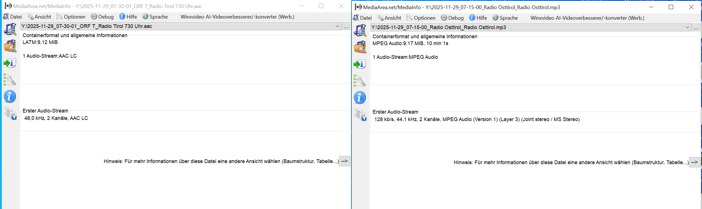 intell Posted yesterday at 03:46 PM Author Posted yesterday at 03:46 PM Hi Griga, im Alter bringt man schon einmal die Namen durcheinander, wünsche dir ein langes, erfülltes Leben! Slider ist für mich der Button vor / rückspulen, mit der Maus draufbleiben und Knopf bewegen. Scheint ein " Slave" Problem zu sein, Laptop über WLan mit Mediaserver rtsp verbunden, da tritt bei mir der Effekt auf. Da kann ich bei AAC Radio Sendern die Timeshift Aufnahme nicht nachhören, bei MPEG codierten Sendern geht es. Werden da bei AAC gewisse Timestep Daten nicht mitübertragen? Anhang Senderliste >> Radio Maria ist MPEG codiert Schönen Abend noch Quote