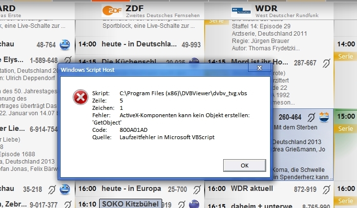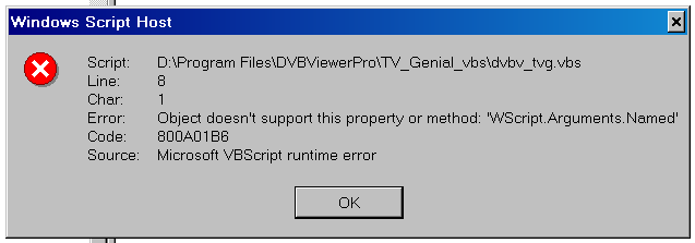 qqw Posted November 28, 2005 Posted November 28, 2005 Hi, bei mir fuktioniert das Script nicht. Im DVBViewerPro (neuste Version) hab ich Scripte aktiviert und alles in TvGenial eingetragen wie beschrieben. Es kommt immer einer Fehlermeldung: "Object doesn't support this property or method: WScript.Arguments.Named" Habe einen Screenshot angefügt. Könnt ihr mir bitte weiterhelfen? Quote
