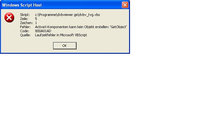 semko Posted October 26, 2005 Posted October 26, 2005 Schade bei mir gehts nicht. Da fehlt wohl irgendeine ActiveX omponente. Weiß einer damit etwas anzufangen. Anlage <{POST_SNAPBACK}> Kann es sein, dass du im Script die Zeile On Error Resume Next auskommentiert oder gelöscht hast? Dann würde der angezeigte Error nämlich mit Sicherheit auftreten, wenn der DVBV nicht läuft, wenn das Script gestartet wird. Sem Quote
